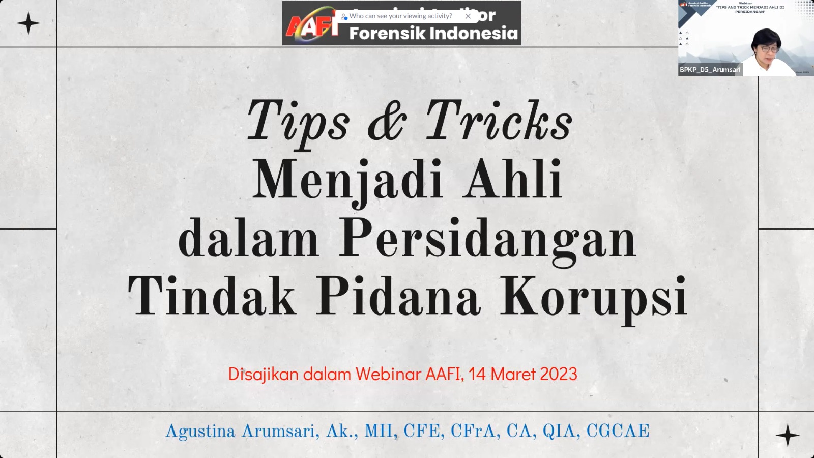 Terkait hal itu, AAFI TELEME menggelar webinar bertajuk Tips and Tricks Menjadi Ahli di Persidangan yang menghadirkan Ibu Agustina Arumsari, Ak., M.H., CFE, CFrA, CA, QIA, CGCAE (Deputi Investigasi BPKP) sebagai Narasumber dan Ibu Dr. Selvia Vivi Devianti S.E., M.Sc., MCP., Ak, CFrA, CFE, CSFA (Direktur Litbang BPK RI) selaku Moderator.�