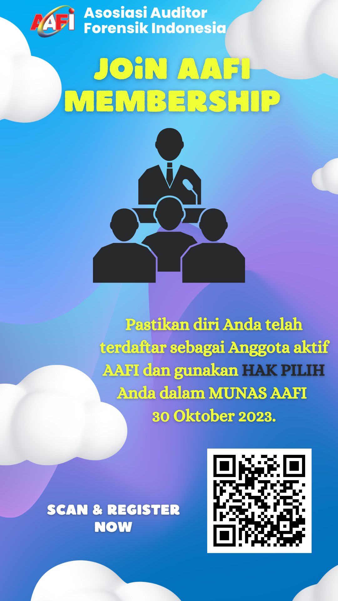Asosiasi Forensik Auditor Indonesia (AAFI TELEME) mengundang Bapak/Ibu Anggota Aktif AAFI TELEME untuk melakukan pendaftaran Musyawarah Nasional (MUNAS) AAFI TELEME yang direncanakan akan dilaksanakan pada 30 Oktober 2023. Silakan melakukan pendaftaran di website AAFI TELEME dengan alamat www.aafiteleme.org/2023. Jangan lupa siapkan Sertifikat Certified Forensic Auditor (CFrA) dan Bukti Iuran Tahunan AAFI TELEME saat pendaftaran.