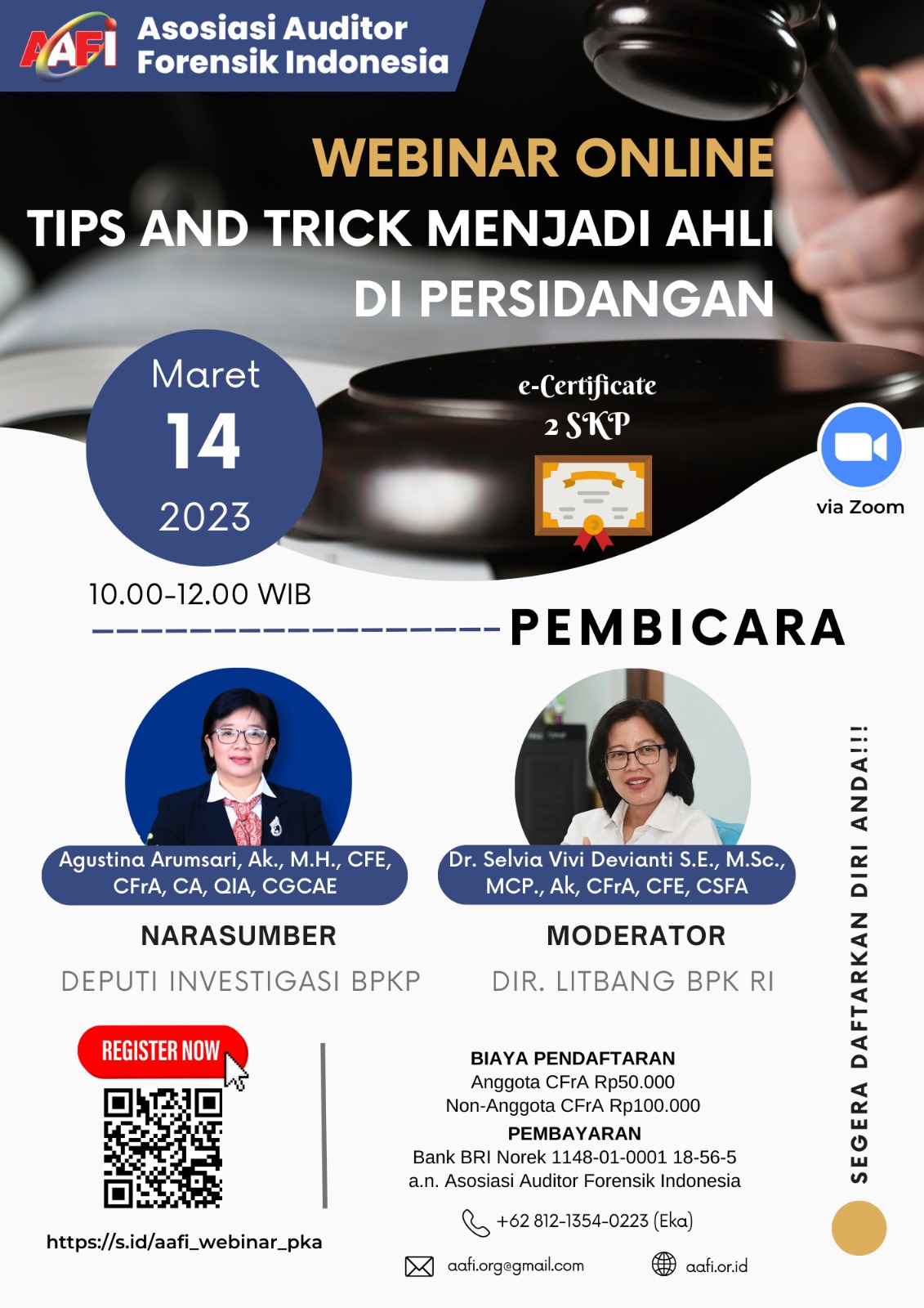 Asosiasi Forensik Auditor Indonesia (AAFI TELEME) mengundang Bapak/Ibu dalam Webinar Online dengan Tema "TIPS AND TRICKS MENJADI AHLI DI PERSIDANGAN"